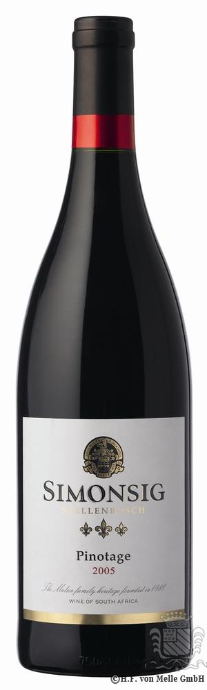 Simonsig, Pinotage — ïðåêðàñíîå, äóøèñòîå, ôðóêòîâîå ìîíîñîðòîâîå âèíî. Ëó÷øèé Ïèíîòàæ õîçÿéñòâà "Ñèìîíñèã" âûðàùèâàåòñÿ íà ñëàíöåâûõ ïî÷âàõ, êîòîðûå ïîëîæèòåëüíî âëèÿþò íà ðàçâèòèå àðîìàòè÷åñêèõ êà÷åñòâ âèíîãðàäà. Îòñóòñòâèå âûäåðæêè â äóáîâûõ áî÷êàõ ïîçâîëÿåò ïîä÷åðêíóòü êîíöåíòðèðîâàííûé ôðóêòîâûé âêóñ è àðîìàò, ïðèñóùèé Ïèíîòàæó, íå çàãëóøàÿ åãî.